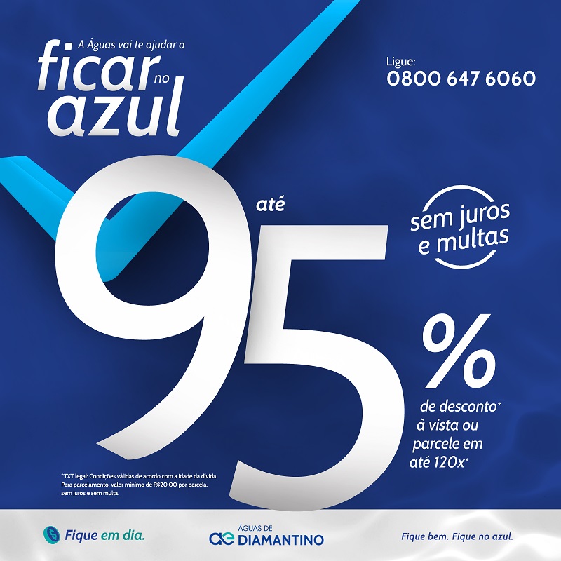 Os consumidores com débitos nas contas de água e esgoto terão a oportunidade de negociar suas dívidas com isenção de juros e multas por atraso, com até 95% de desconto de acordo com a idade da dívida e parcelamento em até 120 vezes com entrada facilitada. Essas condições especiais de negociação serão ofertadas neste sábado (26.06), das 7h às 12h, nas lojas de atendimento da Águas de Diamantino, na Rua Monsenhor Doudreneuf, nº 19, no Centro e na Rua das Paineiras, nº 154, no Novo Diamantino.